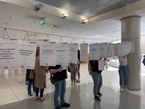 Ein symbolträchtiges Bild bot unsere „Wäscheleine der Forderungen“, an der unsere Anliegen für alle sichtbar angebracht waren. Der Bildungsbürgermeister Herr Grunert nahm sich Zeit, die einzelnen Schilder genau zu betrachten – ein Zeichen dafür, dass unsere Stimmen gehört wurden.